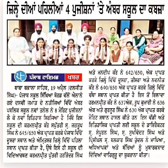In the session 2023-24,eight students of Amber school were placed in the merit list issued by P.S.E.B. in the matriculation examination.Out of these,four students got first four positions in Amritsar district of Punjab. Third position in Punjab state was earned by Karmandeep kaur securing 645 marks out of 650 in matriculation in the session 2023-24 Dozens of students got merit positions in the middle, matriculation and senior secondary examinations conducted by P.S.E.B. in the last five years. Many old students of this institution are studying abroad after getting good bands in IELTS.